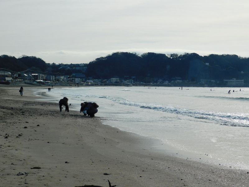 -- 由比ヶ浜でさくら貝を探す人々。9:30